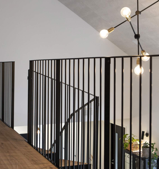 Лестничные ступени и прямая рама Спаниш от HOSET навеивают мысли о старой финской фабрике. Перила и ступени изготовлены из высококачественного массива дерева.