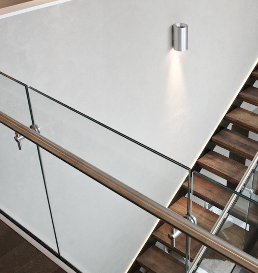 Glass railings have metal or wooden handrails. The same handrails are mounted on the wall.